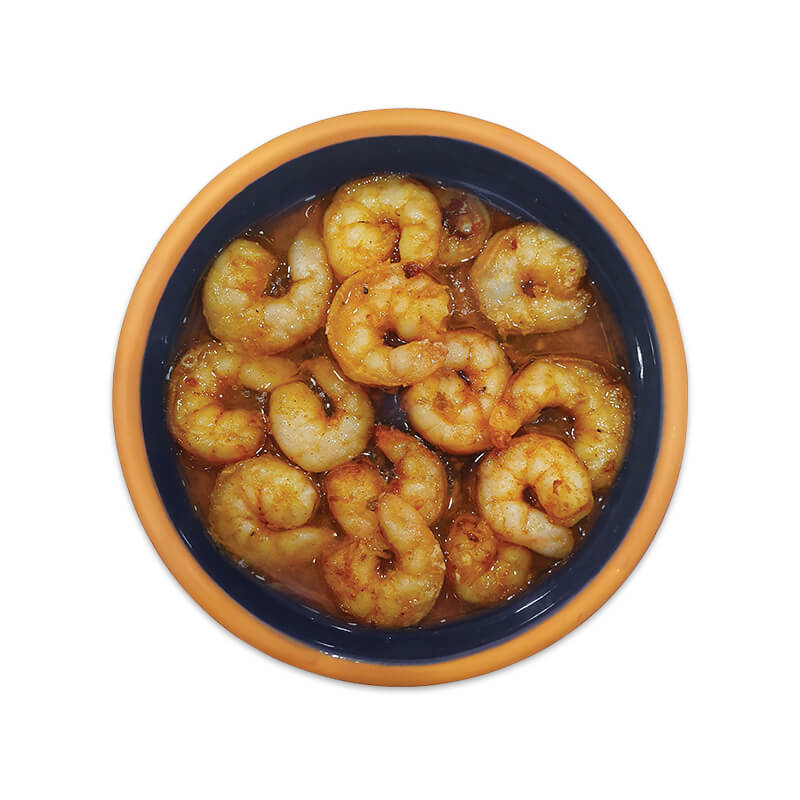 Temizlenmiş, soyulmuş, şişlere geçirilmiş ve dondurulmuş Jumbo Karides Eti (Penaeus vannamei) (%80), baharat, tuz, sıvı yağ, su (glaze oranı %20).