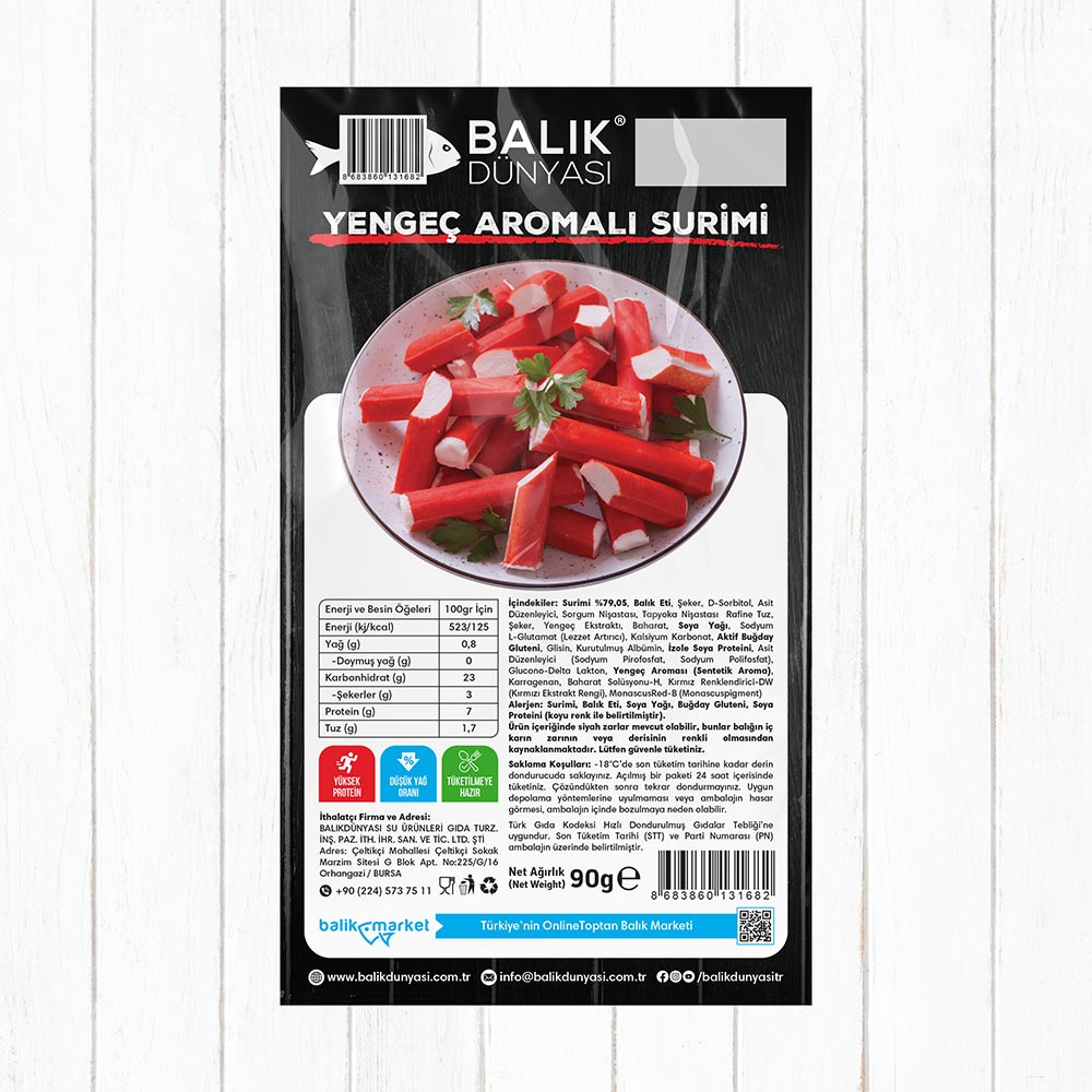 Surimi, Balık Eti, Soya Yağı, Buğday Gluteni, Soya Proteini (koyu renk ile belirtilmiştir).